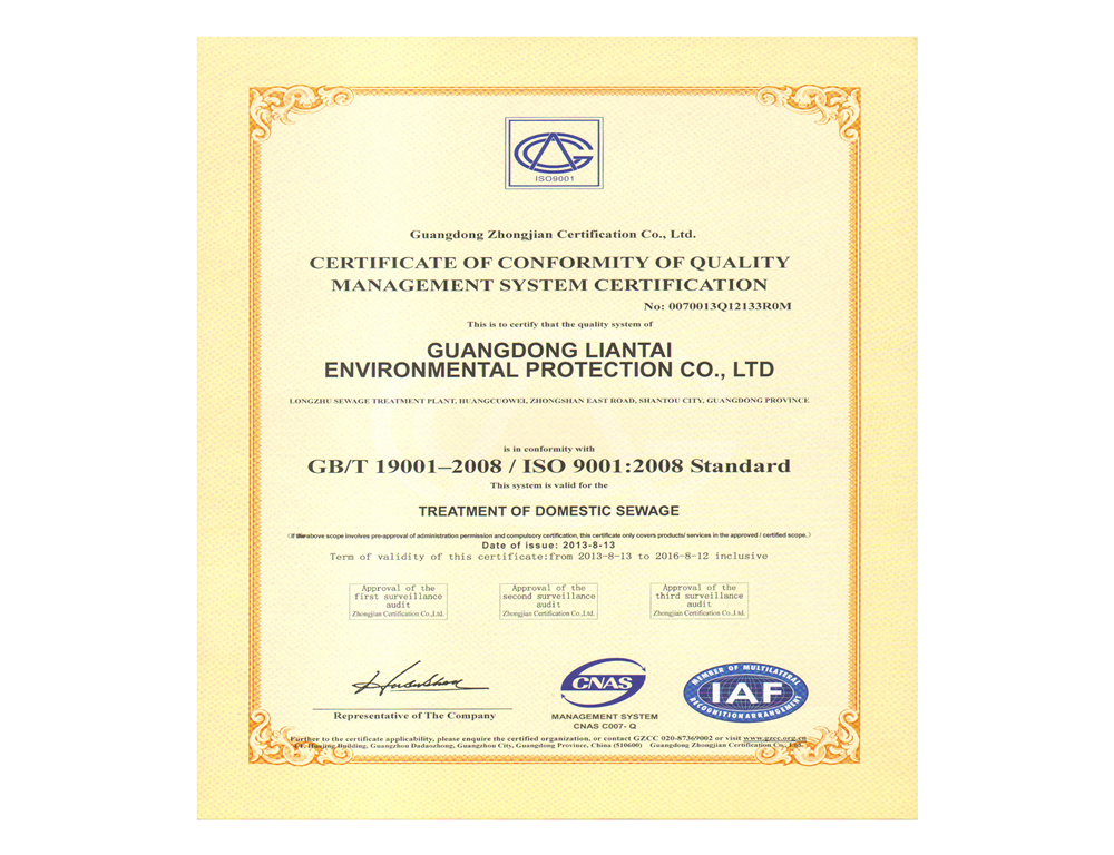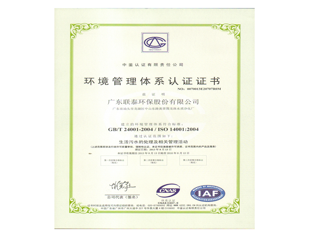 中國環境服務認證證書